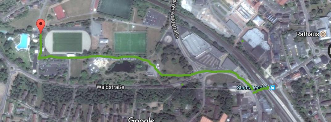 Mit dem Zug bis zum Halt „Stadtallendorf“, von dort aus ca. 10 Minuten Fußweg zum Stadion siehe Skizze.