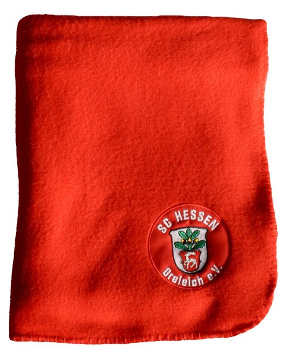 Feelcedecke in rot mit gesticktem Logo des SC Hessen Dreieich, für die kalte Jahreszeit. Maße: 32 x 26 cm (L x B). Material: 100 % Polyester-Fleece.